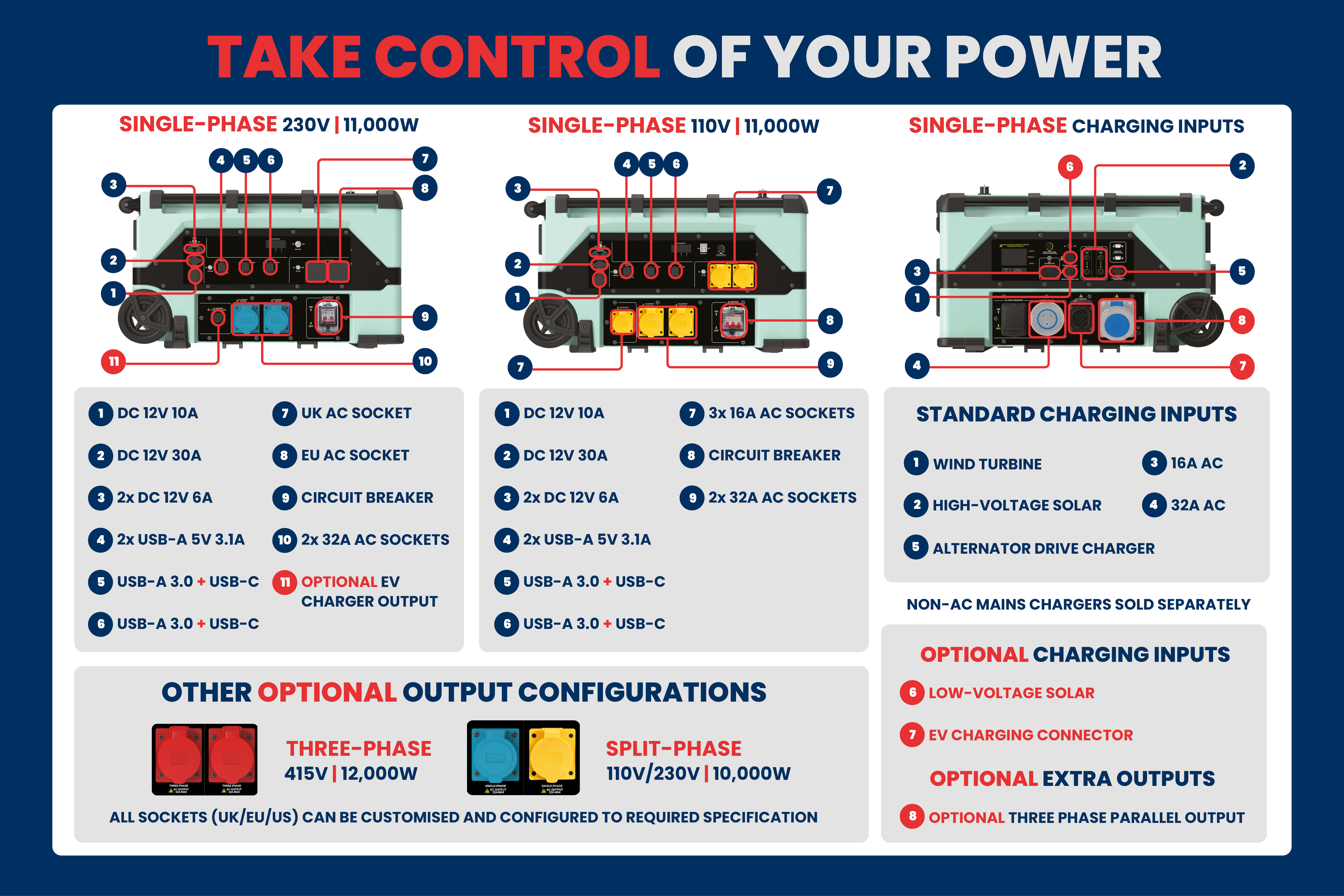 Comprehensive AC and DC output configuration supports UK, EU, 16A and 32A site equipment connections.