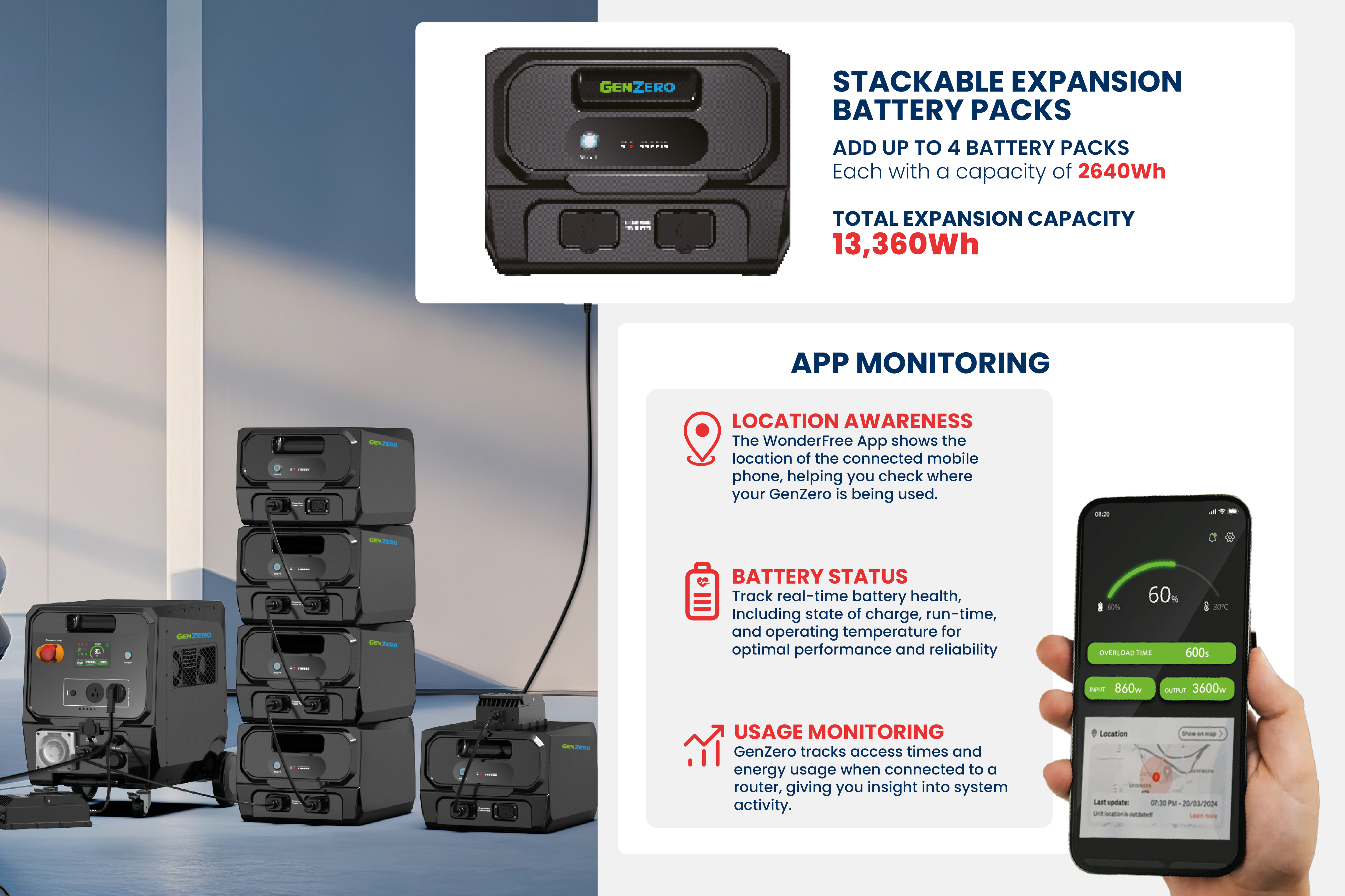 The GenZero Onyx 3600 is a professional-grade portable power station built for demanding environments where reliability and silence are essential. Delivering 3600W of continuous pure sine wave output and up to 18,000W peak power, it easily runs high-draw tools, lighting systems and sensitive electronics. Its 2800Wh internal battery provides dependable off-grid energy and can be expanded up to 13,600Wh with stackable battery packs for extended runtime. Housed in a lightweight yet rugged carbon-fibre shell and rated IP66, the Onyx is protected against dust and heavy rain. Ultra-quiet 35dB operation and fast three-hour recharging ensure minimal disruption and maximum productivity on every job.
